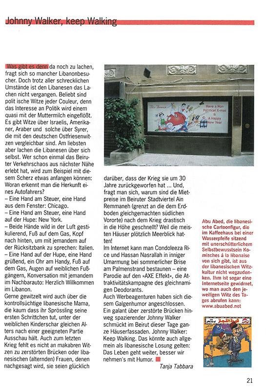 "Libanon verstehen" zeichnet sich aus durch großen Enthusiasmus und tiefgründige Kenntnisse über den Libanon, das Leben und die Menschen im Land und spart auch politische, soziale und historische Hintergrundinformationen nicht aus. Das Magazin stellt eine umfassende Lektüre für Interessierte dar und wird Libanon-Besuchern Verständnis durch Informationen und die Liebe zum Land lehren. Dafür sei Ihnen und den vielen Mitstreitern bei diesem Projekt ganz herzlich gedankt.